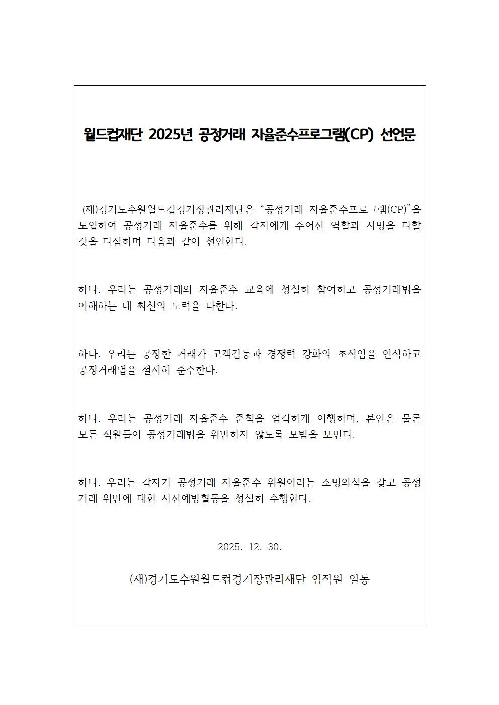 이에 월드컵재단 공정거래 자율준수 프로그램 선언문을 붙임과 같이 대내·외에 공유하여, 공정거래에 대한 준법의식을 제고하고 자율준수 문화를 확산하고자 합니다.