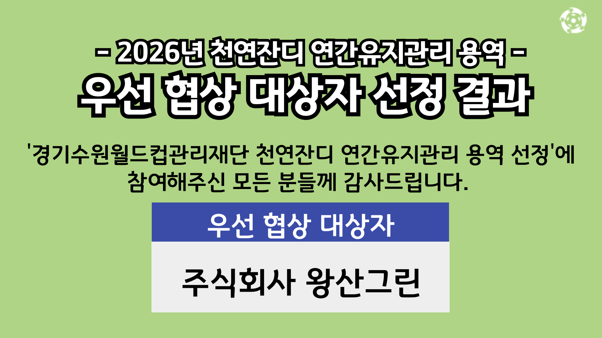 2026년 경기수원월드컵재단 천연잔디 연간유지관리 용역 우선협상대상자 선정 결과입니다.