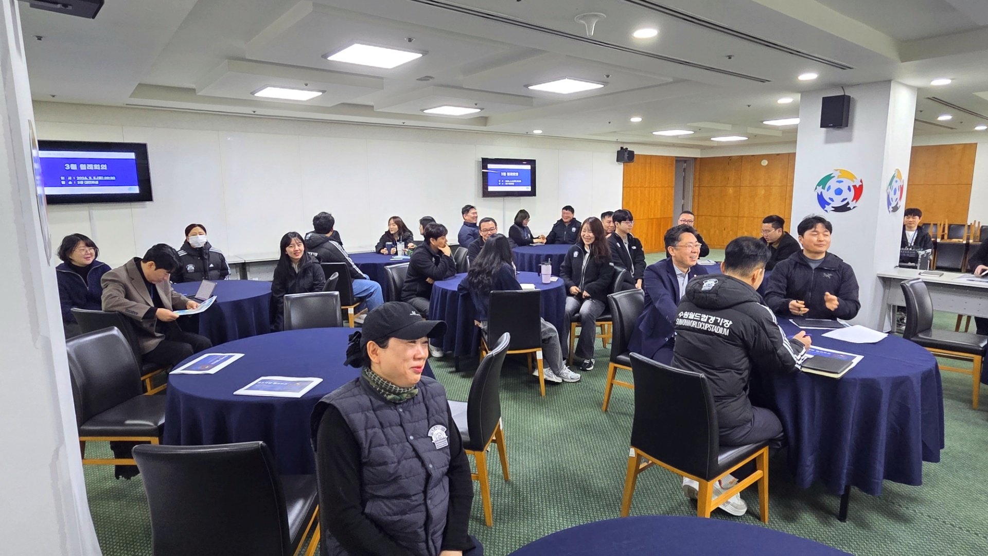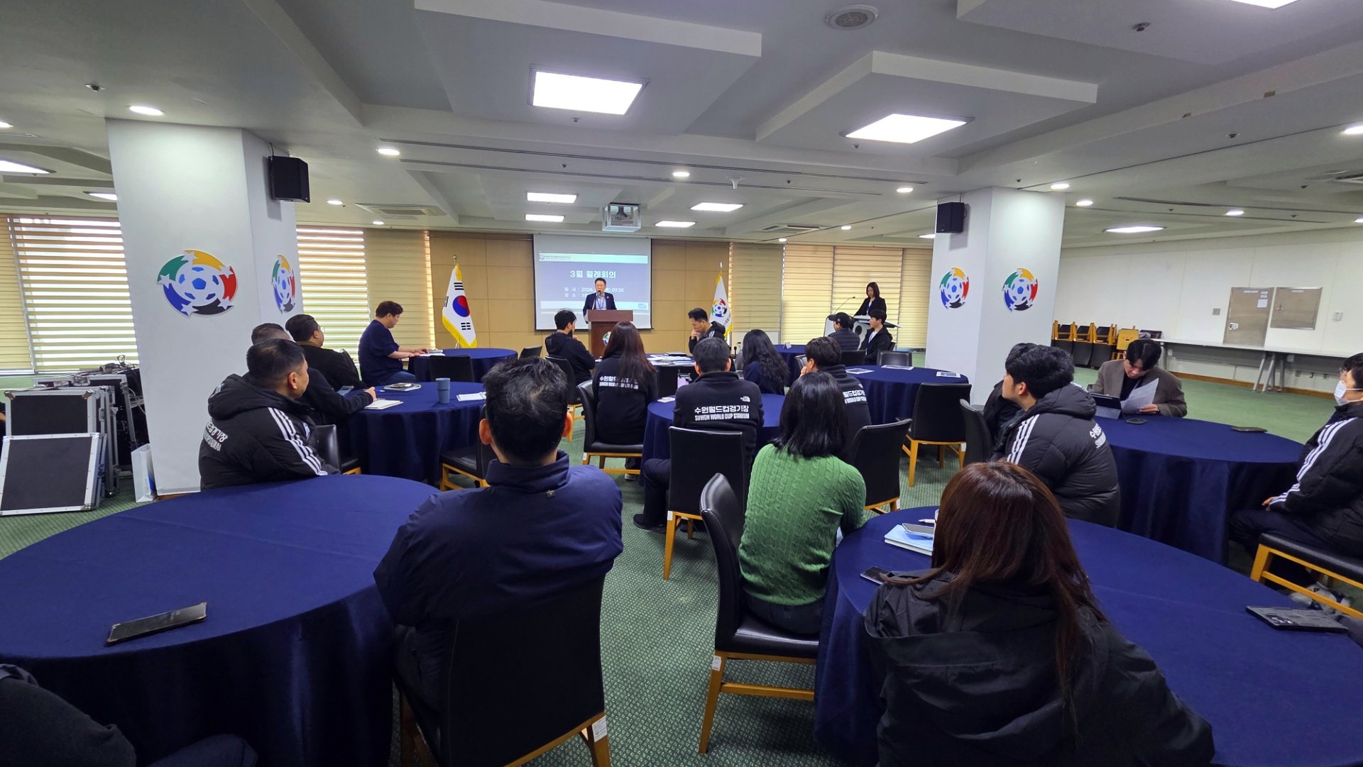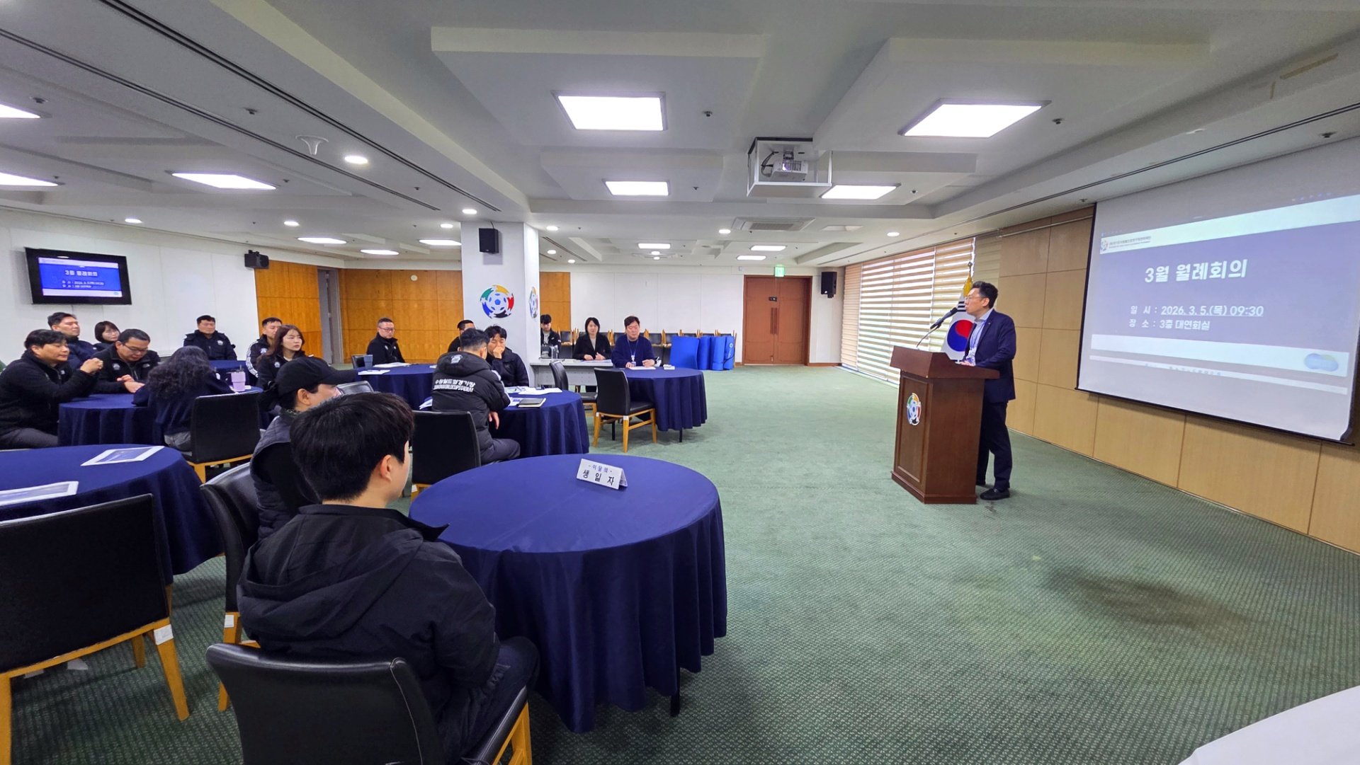 회의 종료 후에는 경기장 시설 이용객의 안전 확보 및 위기 대응 역량 강화를 위한 전 직원 안전 교육이 이어졌습니다.