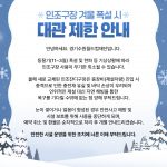 동절기(11~3월) 폭설 및 한파 등 기상상황에 따른 대관 제한 안내입니다. 안전한 시설 운영을 위한 조치이니 너른 이해 부탁드립니다. …
