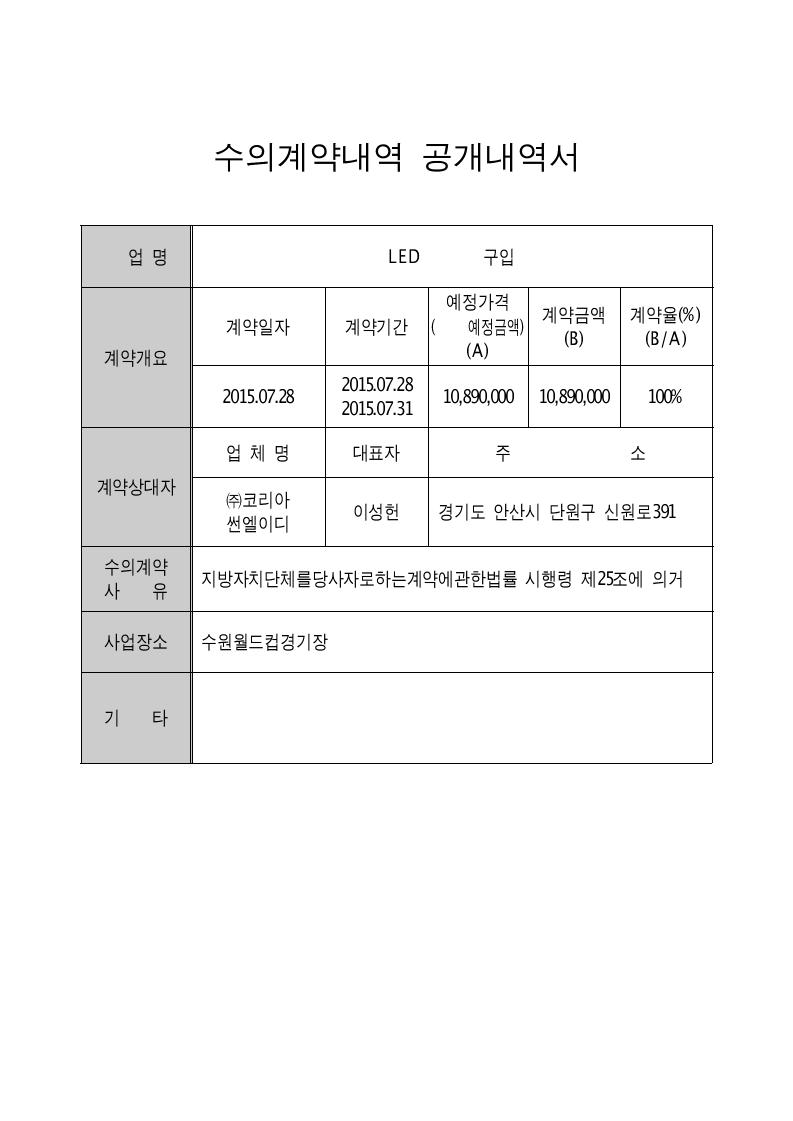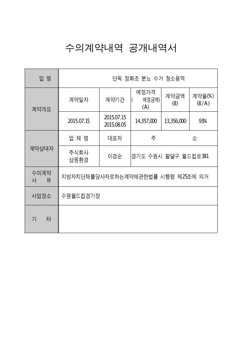수의계약내역 공개내역서 업 명 단독 정화조 분뇨 수거 청소용역 계약개요 계약일자 계약기간 예정가격 ( 예정금액) (A) 계약금액 (B) 계약율(%) (B/A) 2015.07.15 2015.07.15 2015.08.05 14,357,000 13,356,000 93% 계약상대자 업 체 명 대표자 주 소 주식회사 삼원환경 이경순 경기도 수원시 팔달구 월드컵로381 수의계약 사 유 지방자치단체를당사자로하는계약에관한법률 시행령 제25조에 의거 사업장소 수원월드컵경기장 기 타